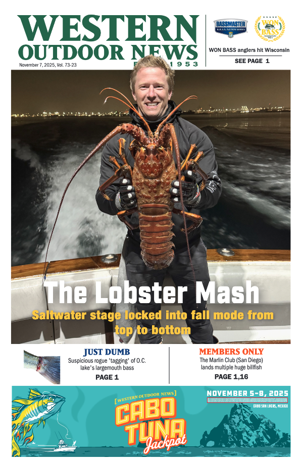 The November 7 issue of WON featured Lars Walton with a big Long Beach Harbor lobster on the cover. While it doesn’t always happen, we try to do at least one lobster cover per year, and that comes with challenges. For one, a lot of the photos are taken at night (we fight the same battle with white seabass imagery), and lighting for a photo that’s going to be published that size (digitally and print-ally) is key.