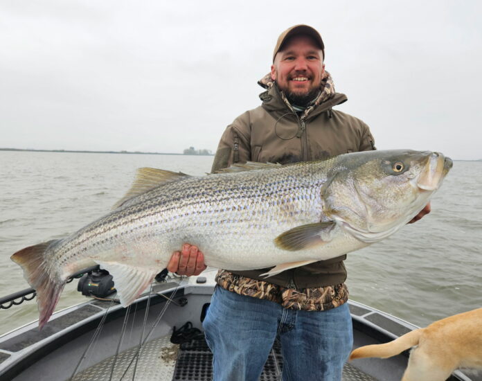 At 70 feet behind the boat, and after peeling off another 20 yards of braid, there was little chance that the fish would tangle the boat, the motor or any other gear and with an experienced angler handling the rod, the chase was on. Into the deep water, back to shore, under the boat, around the boat, the fish fought heroically for more than 15 minutes. Twenty yards from the boat, the fish surfaced. As Reimers describes it, “it was the biggest, most beautiful striper he’d ever seen. “A short tussle later and the fish came to the net. With three extra hands the net was easily held in the water until the hook was removed. After a few pictures a fully revived trophy was released.