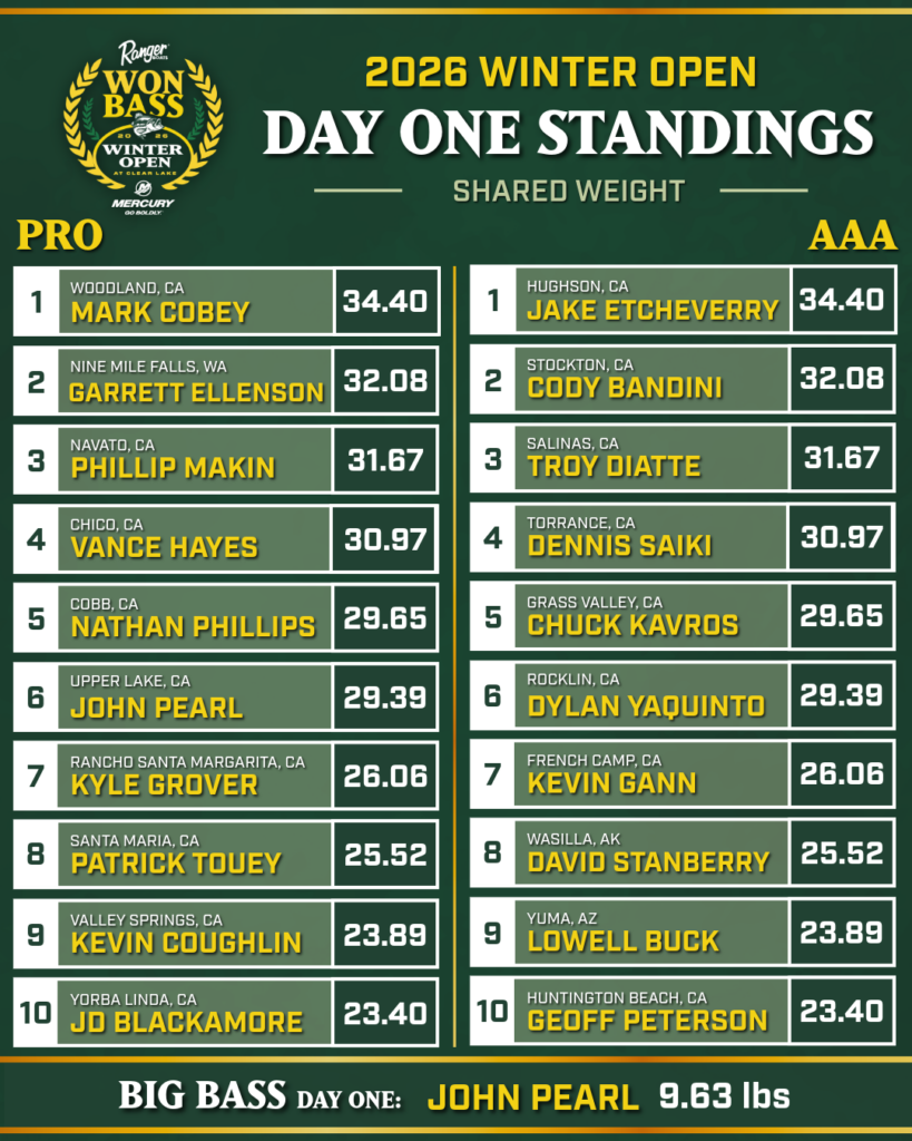 The 2026 WON BASS Winter Open at Clear Lake is brought to you by Bass Pro Shops, Ranger Boats, Mercury Marine, Nitro Boats, Triton Boats, Bridgford Foods, Stealth Lithium Batteries, Power Pole, Lowrance, Daiwa, AFTCO, Costa, Berkley, Abu Garcia, Fenwick Rods, Anderson Toyota, Okuma, A&M Graphics, Reese Fishing, Anglers Marine, Signature Gate Systems, DD26 Fishing, Loco’s Cantina, Gone Fishing Marine and G-Ratt.