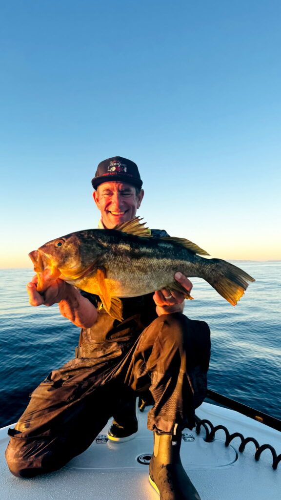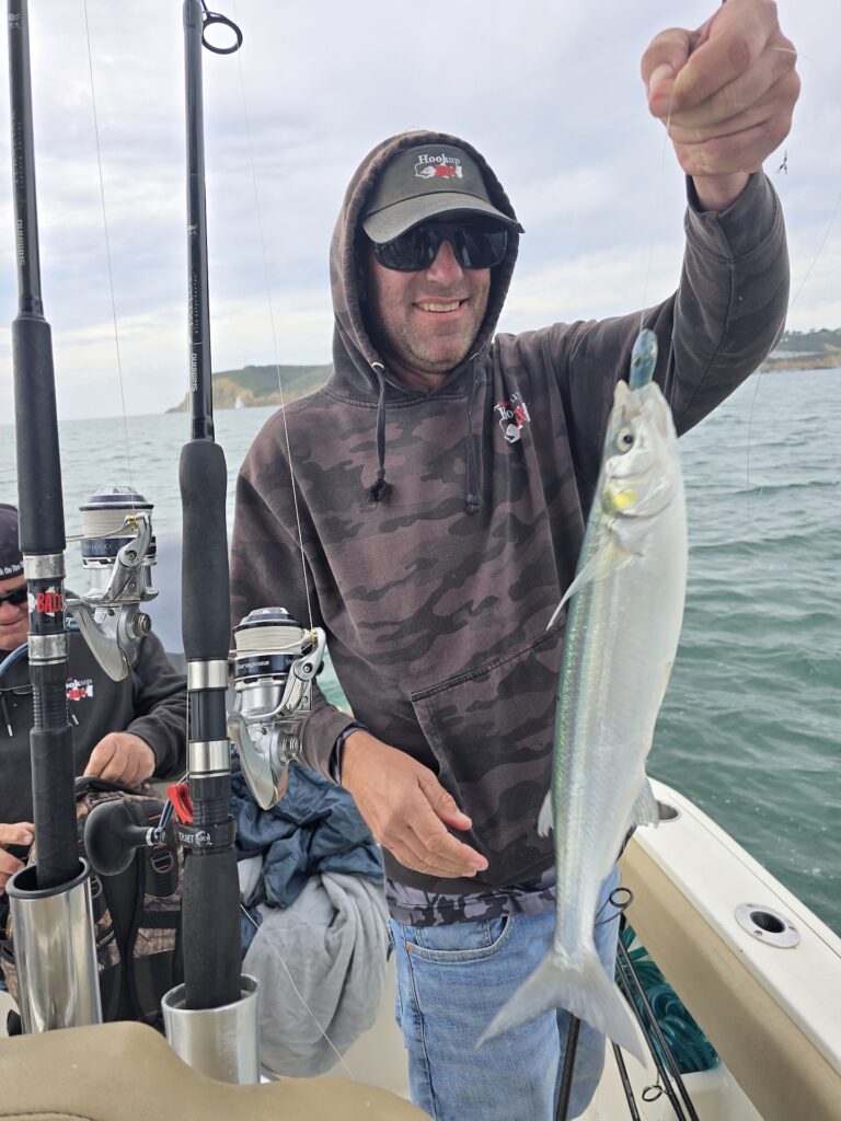 Our first stop was a rock just outside the mouth of San Diego Bay, a spot that always seems to hold bass. Tom’s Hookup Baits A-rig was the first line in the water—and the first to get bit. He landed a double sand bass, and Dale doubled up right alongside him. We were off to a great start.