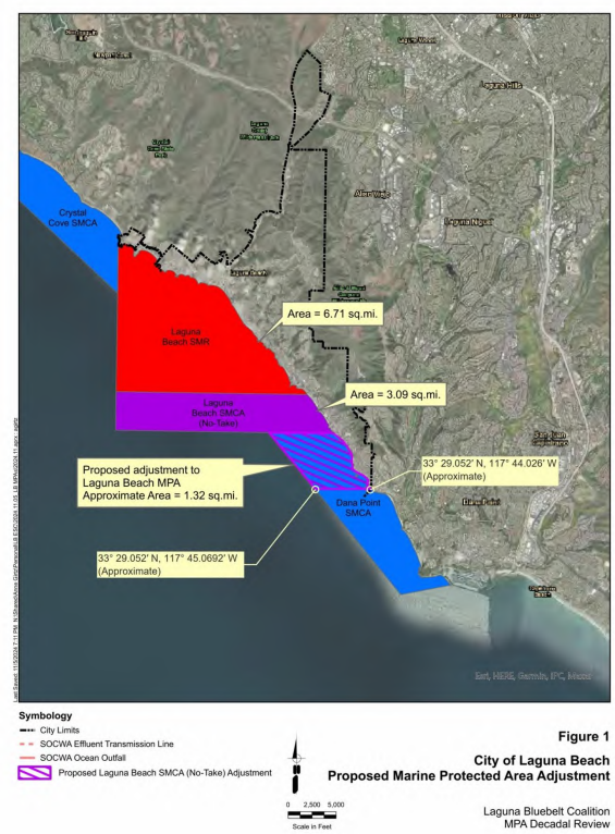 SAN CLEMENTE – Along the Orange County coastline, which covers from the mouth of the San Gabriel River in the north, at Seal Beach, to the northern boarder of Camp Pendleton in the south, there are 6 Marine Protected Areas. These include two lagoon areas closed to fishing, the Bolsa Chica State Marine Conservation Area or SMCA, and the Upper Newport Bay SMCA. Covering the coastline from the mouth of Newport Bay to the bend in the breakwater at Dana Point are a series of 4 MPAs edge-to-edge. On the north the Crystal Cove SMCA which disallows the tide pool picking. It extends to the northern Laguna Beach City Limit. From there, south to about the point at Seacliff Drive are paired no-fishing closures creating a triangle closure extending almost 3 miles offshore. The upper portion of this fishing closure is the Laguna Beach State Marine Reserve or SMR. The lower quarter of the closure is made by the Laguna Beach SMCA. It only allows permitted take in association with infrastructure maintenance and waste water impacts, basically because Laguna Beach’s sewer pipe runs through those waters. From there to the bend in the Dana Breakwater is the Dana Point SMCA, where fishing is allowed but tidepool picking is not. What Petition 2023-24MPA would do is extend the Laguna Beach SMCA, and close half of the Dana Point SMCA to fishing to the southern city limit of Laguna Beach, basically closing all fishing within Laguna Beach City Limits.