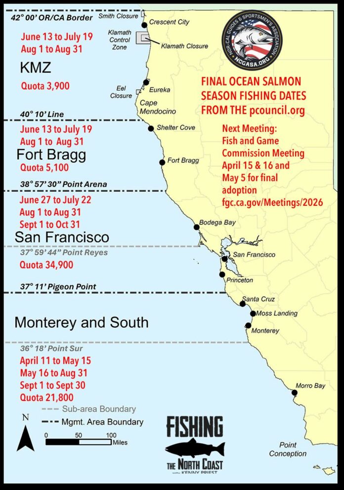 SACRAMENTO – Significant improvements in key California salmon populations – specifically Sacramento River fall-run Chinook and Klamath River fall-run Chinook – will allow for more ocean salmon fishing opportunities this year. The California Department of Fish and Wildlife (CDFW) is pleased to announce that commercial ocean salmon fishing is back after being closed three straight years and that recreational ocean salmon anglers will have more opportunities in 2026.