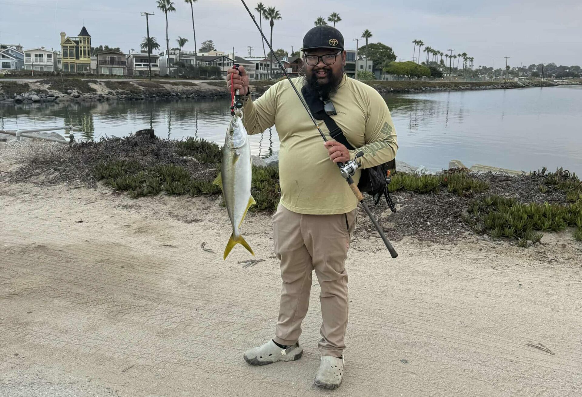 SEAL BEACH – Goleta angler Arlo Claveria was visiting his cousin and taking advantage of rare access to Alamitos Bay “backwaters” when he hooked up to something pulling quite a bit more drag than the typical inland-waters species he was targeting. When the dust settled on that tussle, he was cracking up and holding up a firecracker yellowtail for the camera.