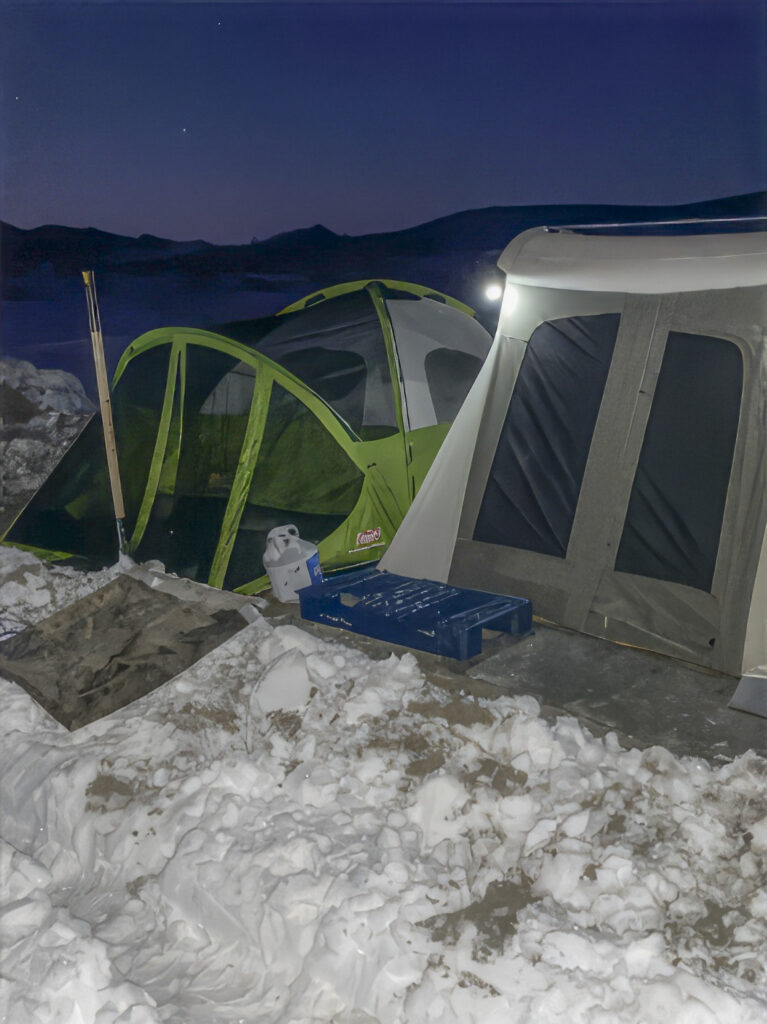 He has a 10×14 winter Kodiak Tent with a stove inside, and he enjoys the solitude his camp offers.
